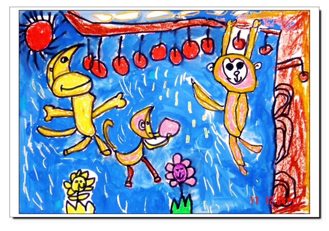 您现在的位置: 开心谷艺校 >> 美术类 >> 学生作品 >> 大华校区作品 >> 正文 [组图]★小猴在干什么 本课是图形的组合画小猴,对有些小宝贝们是有些难度的,继续运用油水分离的方法绘画了小猴子,宝贝们的表现还多不错。在评画时,有的小宝贝说:我的小猴在照镜子,原来是一只超爱美的小猴子呀!还有的小宝贝说:我的小猴在放鞭炮,看着他的画、听着他说,我们也好像听到了鞭炮噼里啪啦的响声~~宝贝们好可爱啊~~~欣赏孩子们作品的你也来发挥一下你的想象力吧~~~(邱老师)