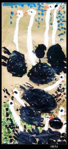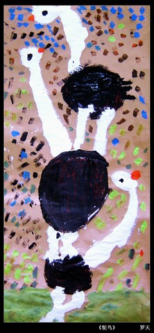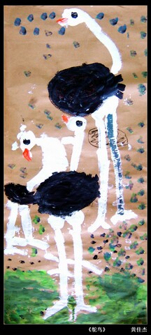 鸵鸟的名字叫“鸟”,但是它真的不能飞哦,因为鸵鸟的祖先是可以飞的,地球发生巨大变化以后,变了很多,于是那种会飞的鸟儿进化成鸵鸟现在这个样子! 鸵鸟的身体像个毛线团,圆圆的厚厚的,脖子长长的,和天鹅的脖子有点相似,而鸵鸟头又是那么的小,它总是生活在草原上和沙漠里...... 这节课让宝贝们在一张很长很长的纸上画画,孩子们有点兴奋,要这么这么长啊~~~孩子们不断用手比划着,学习直接用水粉颜料画鸵鸟了,效果很好很大气哦!另外还让宝宝们自己编一个小小故事,想象力、创造力得到很好的发挥!让我们一起来看看吧~有舞蹈的鸵鸟、说悄悄话的鸵鸟、胖胖的鸵鸟、脖子最长的鸵鸟......(邱老师)