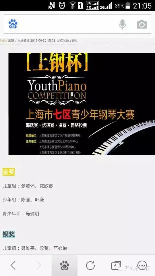 您现在的位置: 开心谷艺校 >> 学校活动 >> 正文 【喜讯】周浦校区沈欣睿小朋友在“上钢杯”比赛中获得金奖 2015-10-14 开心谷艺校 “上钢杯”上海七区青少年钢琴大赛总决赛结果出来啦!开心谷周浦校区的沈欣睿同学,获得儿童组金奖!她在这次比赛整个过程中一直名列前茅,决赛中非常有决心地挑战了一首更高难度的曲目,其中她和妈妈为此付出了很多时间和精力!任何的努力都会有回报!祝贺她!复赛视频