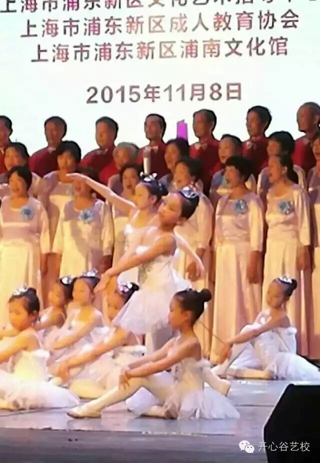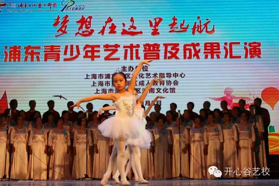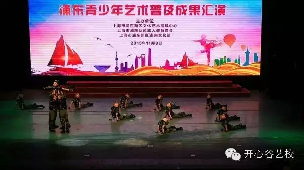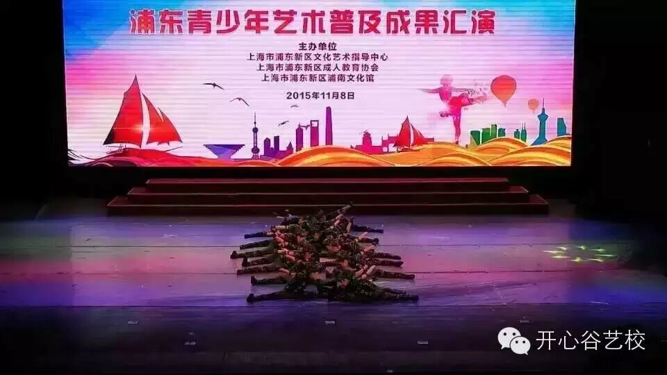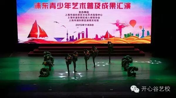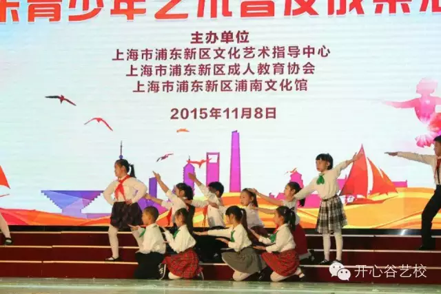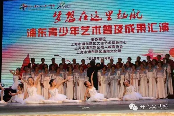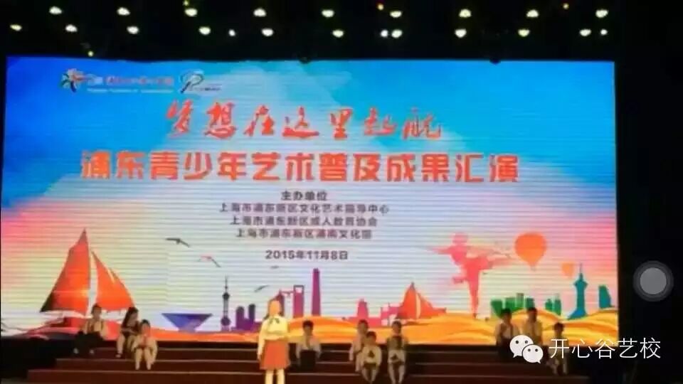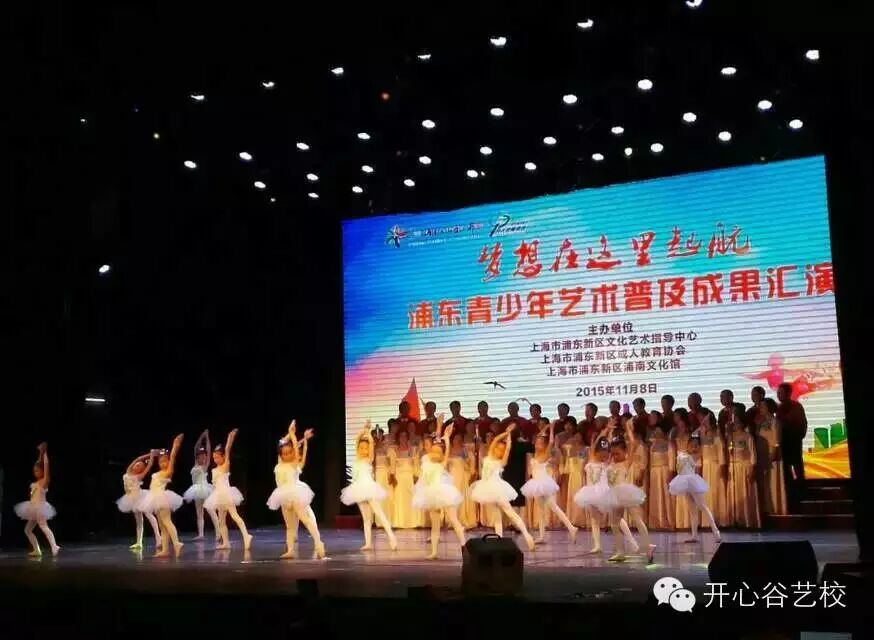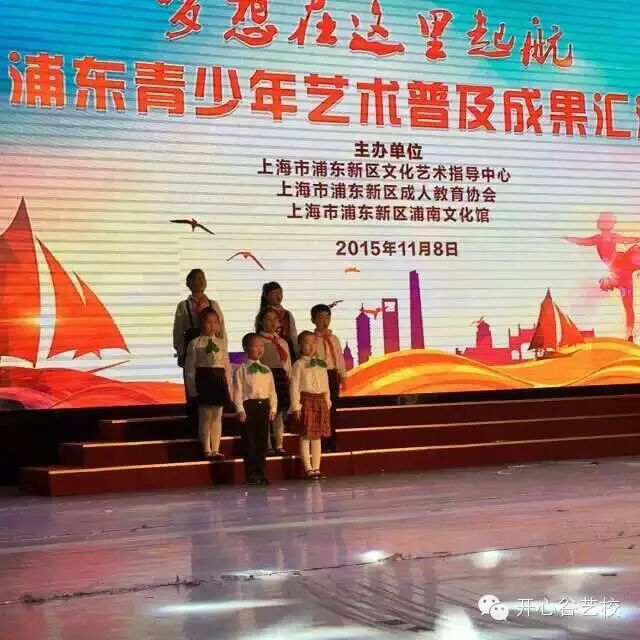 2015年11月8日,开心谷的宝贝们参加了由上海市浦东新区文化艺术指导中心,上海市浦东新区成人教育协会,上海市浦东新区浦南文化馆共同主办,2015 年浦东文化艺术节“梦想在这里起航”,第三场综合场由民非教育机构担纲演出,共计有来自上海浦东九个非民教育机构九个校区参与。在秋末初冬之际,为浦东新区的居民奉上一道温暖的艺术大餐。